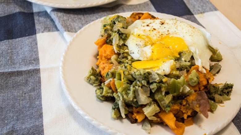 8. 红薯烤好后,去皮,用叉子把红薯划散;每个红薯上放上1/4的煮西兰花 ,一个鸡蛋 ,适量芝士碎,盐,黑胡椒和烟熏辣椒粉 。可以享用啦!