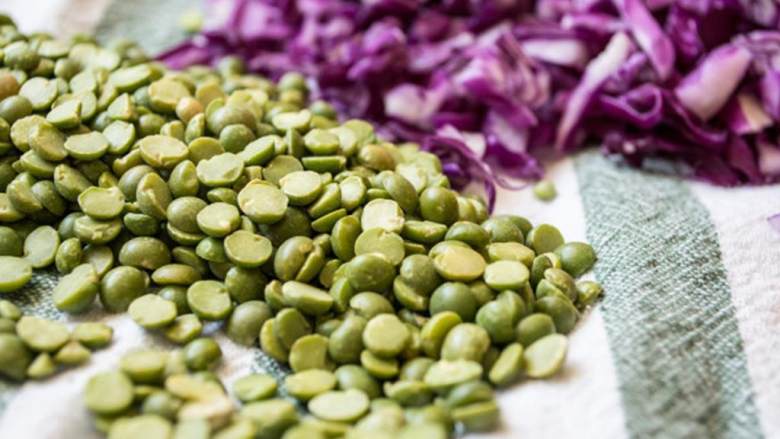 1. 把1/4杯干干豌豆 ,1/2杯鹰嘴豆 放入一个小奶锅中,倒入1/2杯水,大火煮沸,然后焖煮大约45分钟,或煮到你喜欢的软硬度即可,冷却,沥干水分。