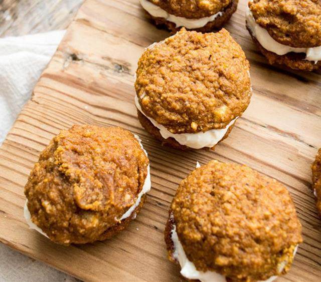6. 把烤好的饼干从烤盘上转移到网架上,充分冷却;现在来制作奶油夹心。碗中放入软化的无盐黄油 、软化的奶油奶酪 、蜂蜜 、香草精 和肉桂粉 ,打发。做成迷你派。