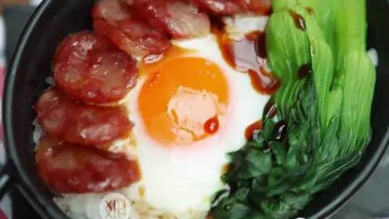 3. 等饭快好前10min放入鸡蛋 和烫熟的青菜,饭烧好后再焖5-10min,时间视你喜欢的蛋黄熟度而定。