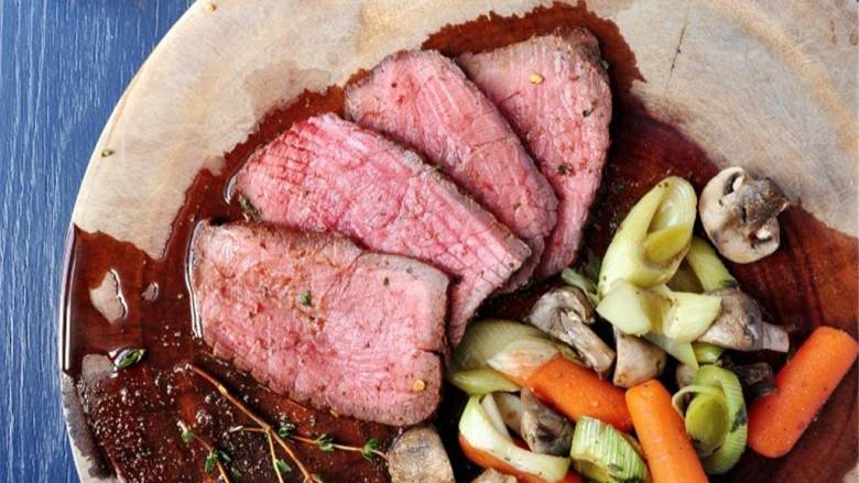 6. 把烤盘和烤架从烤箱中取出,在肋条上盖锡纸,醒5分钟;切片,搭配蔬菜一起吃。享受美味!