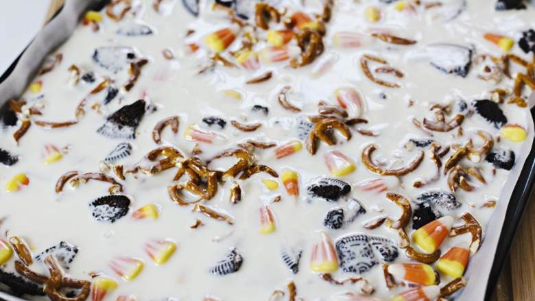 6. 将融化白巧克力倒在奥利奥、咸脆饼和玉米糖混合物上