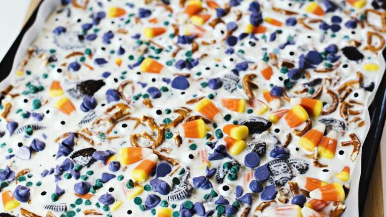 7. 迅速在顶部撒上什锦糖果 和眼睛状糖果 (1/3 cup)