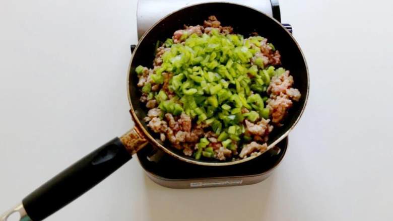 2. 热锅倒入植物油 ,放入腌制好的牛肉糜 ,翻炒均匀。
