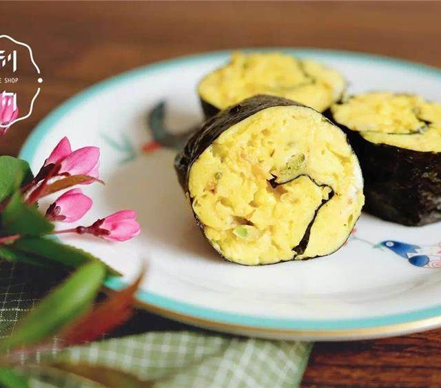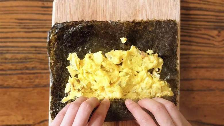 3. 鸡蛋一半凝结时,关火。用余热加热到大约8分熟时盛出,铺在海苔 上。