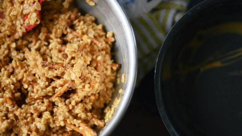 2. 在大碗中,混合大米谷物 和椒盐饼干条,放在一边。