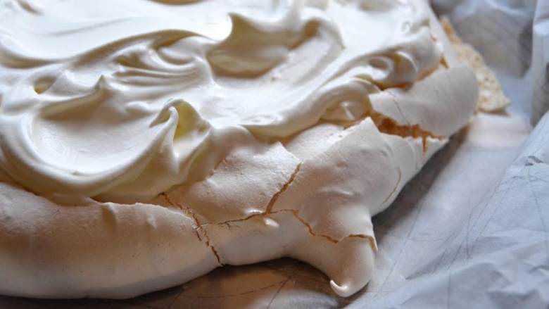 9. 在鲜奶油 中加入绵白糖 打发至粘稠有棱角。将蛋糕转移到选好的盘子上,用刮刀把奶油涂抹到冷却好的蛋糕上,可以做出波浪和尖角的形状。