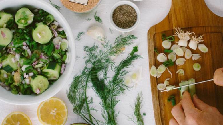 1. 熟牛油果 去核切块,红皮洋葱切块,把大蒜 大蒜瓣 压碎。把青葱 切段,鲜莳萝 切碎。