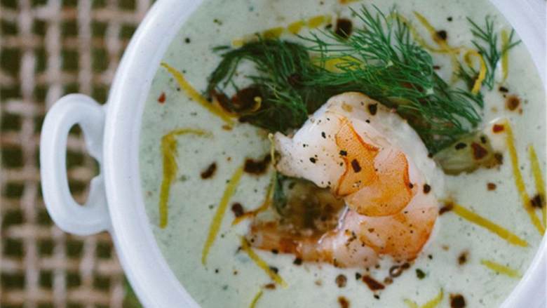 10. 上桌时,把冷汤倒进小碗,在上面放上虾、鲜莳萝、柠檬片。撒上碎红椒,最后撒一点粗盐。