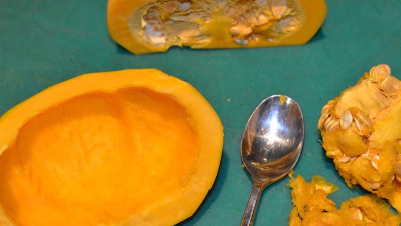 2. 把日本南瓜(1)削皮, 去籽并切掉头和尾。