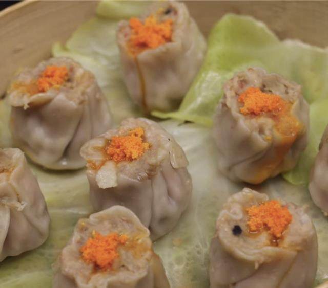 20. 将烧麦块放入蒸笼,再用上一些鱼子。