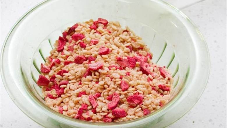 1. 将蜡纸放在一个20厘米的方烤盘中。给蜡纸喷上烹饪喷雾(适量)。给大碗喷上烹饪喷雾(适量)、爆米花麦片(3杯)和冻干草莓(1杯)。
