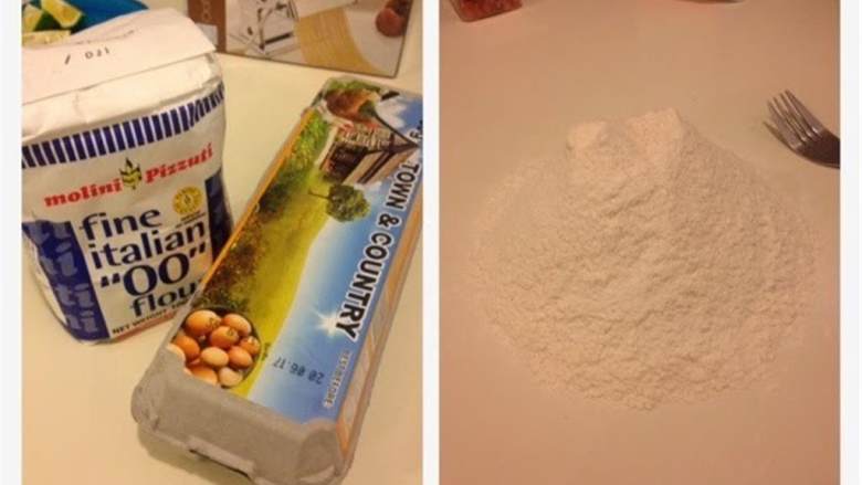 1. 在干净的工作台上把300克“00” 牌意大利细面粉和适量的盐筛在一起。