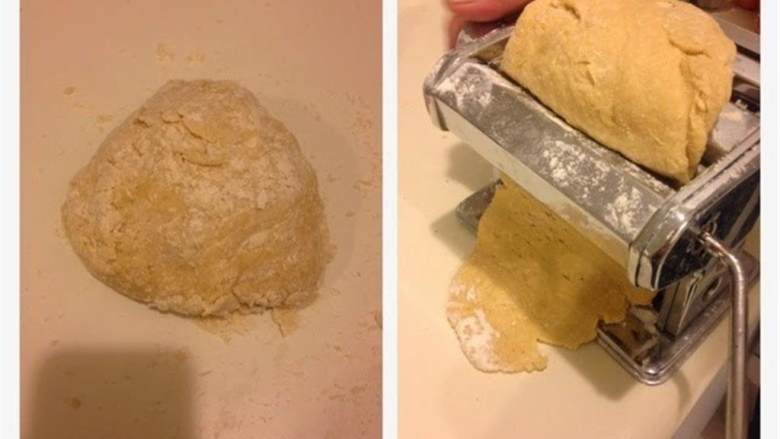 6. 粗略地把面团弄成1厘米厚,然后把擀面条机设置成最宽的宽度9,把面团卷进机器中。重复这一步骤直至面团变得又滑又有弹性。