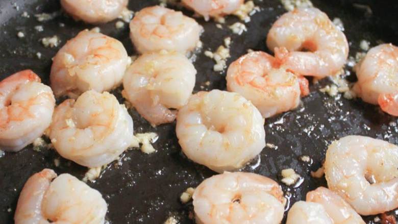 7. 在大平底锅里加热橄榄油(一汤匙)。油热后放入虾,先煎虾的一面,煎两分钟左右后加入大蒜,翻转虾,再煎2分钟,直至虾肉变色且不透明。