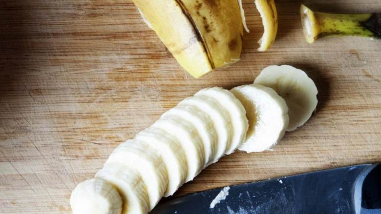 1. 融化无盐黄油, 然后让它冷却。将一半的熟香蕉(2)剥皮,切片。