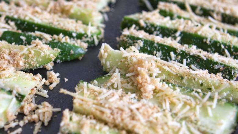 6. 把涂抹完的南瓜条放在烤盘上烤。放入预热的烤箱烘焙20到25分钟,或者直到酥脆金黄即可。