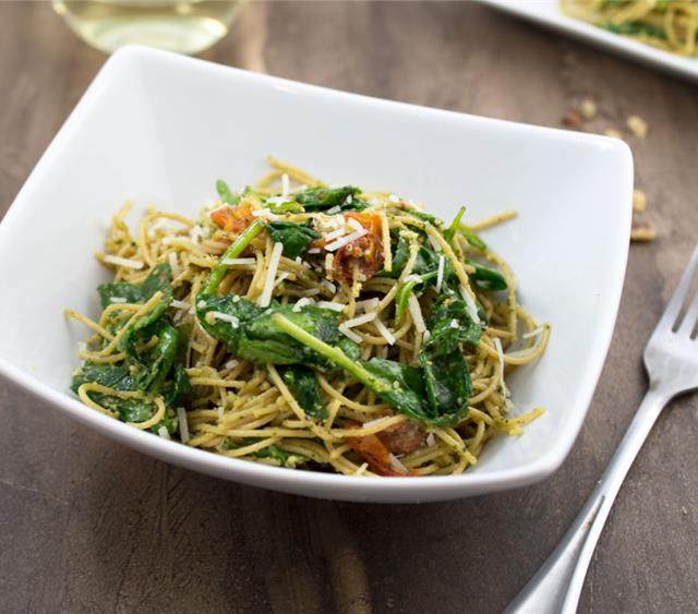 7. 意面煮好后沥干装盘,放上芝麻菜和菠菜(3 杯),浇上酱, 放上烤番茄, 撒上¼ 杯的 帕玛森芝士,盐(1/8 茶匙) 和黑胡椒(1/8 茶匙).。