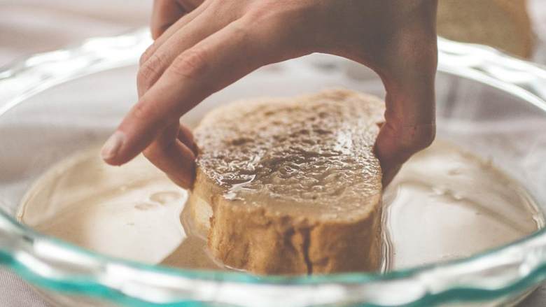 3. 让面包的两面分别蘸到之前调好的液体里10秒,但不要浸透。