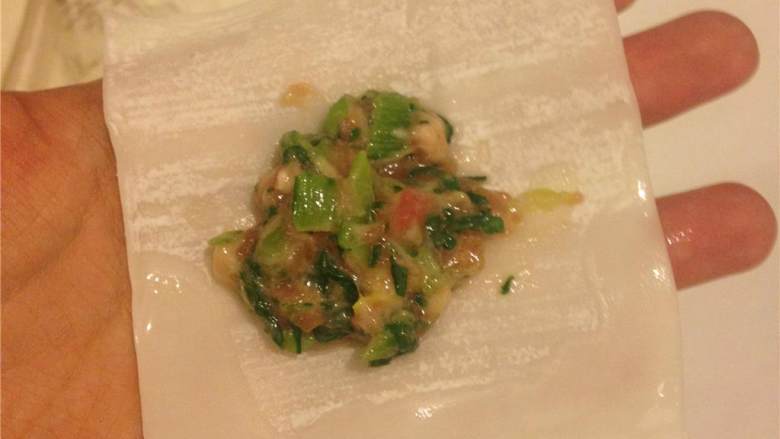 4. 舀 3/4 茶匙的内馅放在馄饨皮的中心。