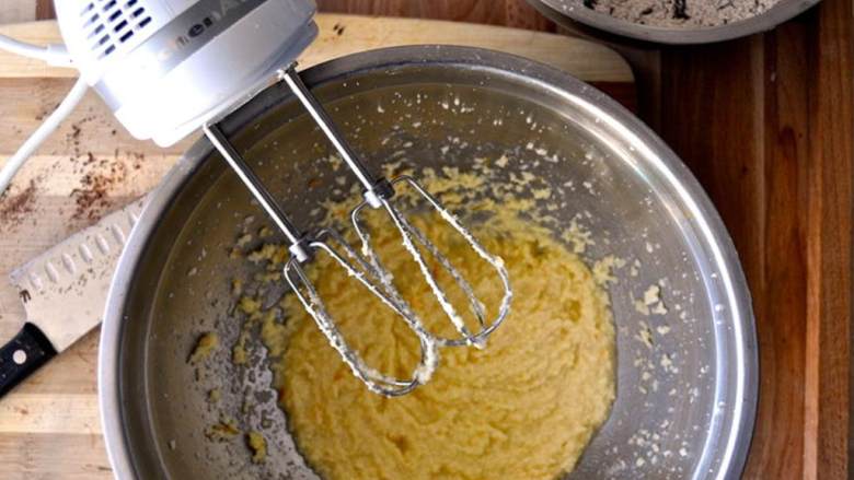 3. 在大号碗(或立式搅拌器)中加入橘子皮、柠檬皮、香草精、常温无盐黄油、香草精。搅拌1分钟,让材料充分混合,切勿混入过多空气。