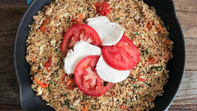 意式鲜奶酪番茄烤藜麦,加入马苏里拉芝士, 粗盐和研磨黑胡椒颗粒. 拌匀后倒入平底锅中, 把表面压平.