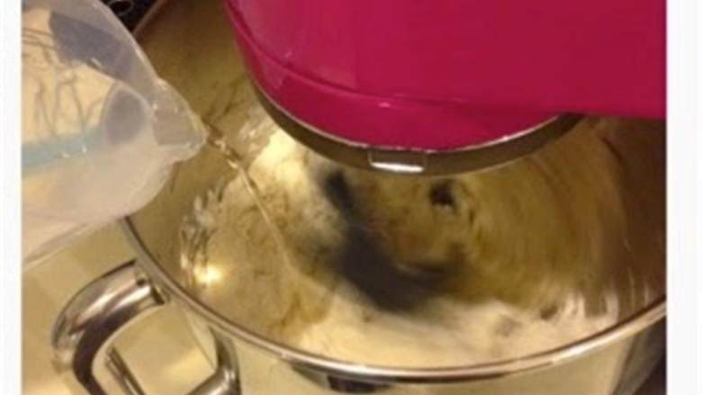 2. 如果你要用立式搅拌器,启动低档搅拌,慢慢倒进温水。如果用抹刀搅拌,就搅1分钟,直到搅成面团没有面粉剩下为止。