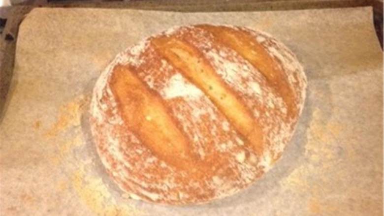 5. 醒发50分钟的时候,将烤箱预热到220度,用耐热碗装些热水放在烤箱底层。再用刀再面团顶部轻轻划几刀口子,烤25分钟。