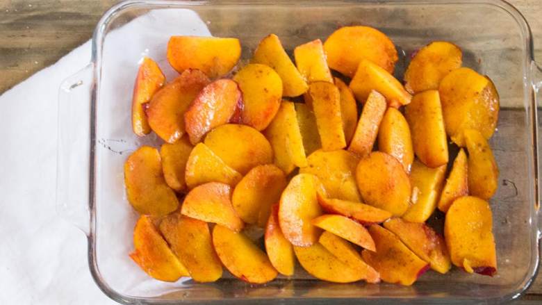 1. 烤箱预热到200度。中号桃子 切块,不要去皮。