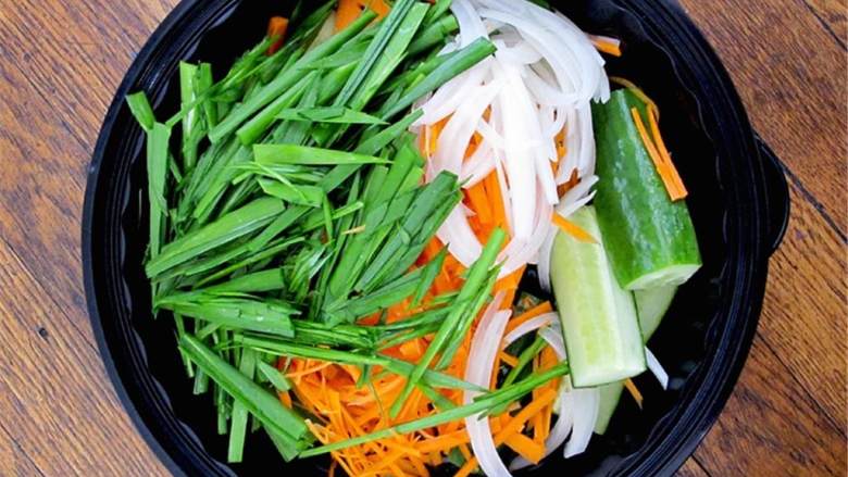 2. 将胡萝卜 、中号洋葱 和韭黄 切成丝。