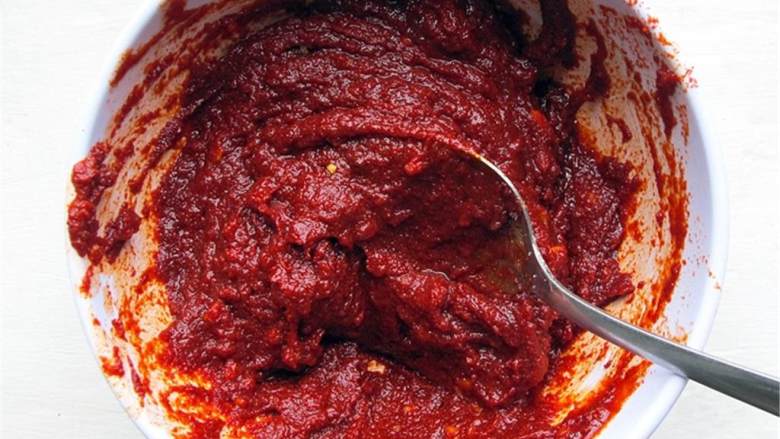 3. 将鱼肉酱、糖、大蒜瓣、米醋、水搅拌均匀后,再加一汤匙水、芝麻籽、芝麻油、粗盐。