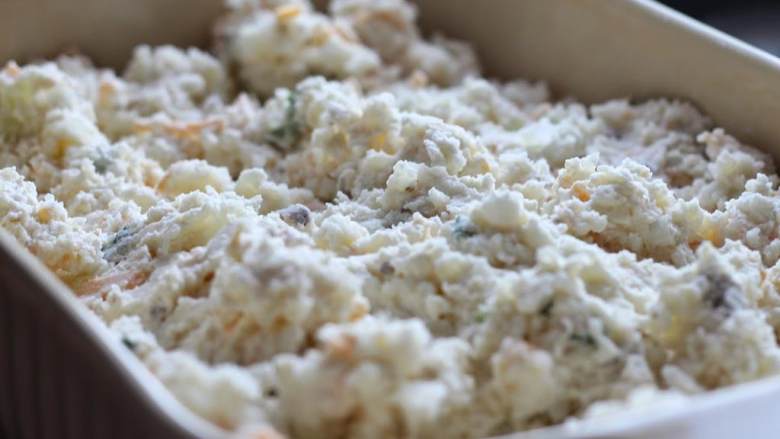 7. 土豆泥中加入一半的车打芝士 ,拌匀。