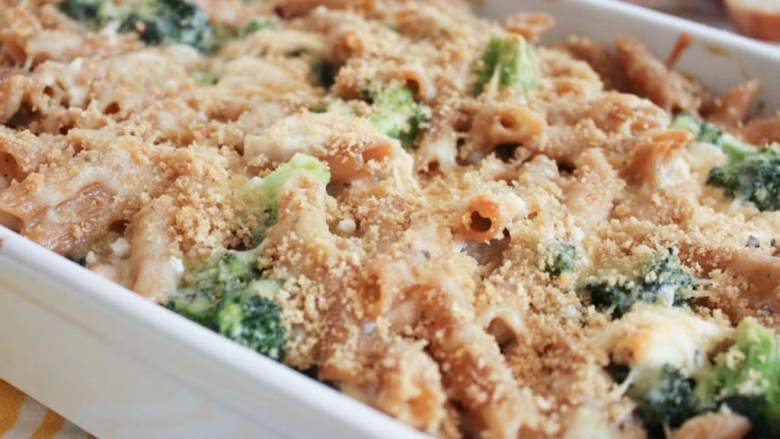 10. 把混合物倒入一个中等大小的烤盘中,洒上剩下的1 1 1 1 1/4 杯意大利果仁羊奶芝士,1 1/4 杯帕玛森干酪,全麦面包屑(1/4 杯)。