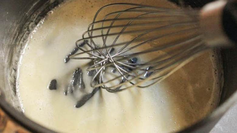 8. 加入百分之一脂含量牛奶 (2 杯) 继续煮,不断搅拌直到稠厚。大概需要6-8分钟。