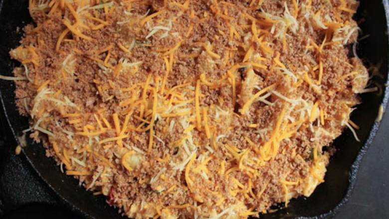 11. 在你的墨西哥起司通心粉上撒上剩下的蒙特里杰克芝士和切达芝士, 各¼ 杯,再撒上一层 全麦面包屑(1/4 杯)。烤30分钟直到芝士融化。