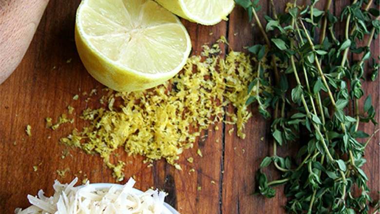 3. 同时做馅料,将柠檬(1)去皮,榨取柠檬(1/2)汁,切好新鲜百里香,在碗中混合干面包屑, 全全脂牛奶乳清, 柠檬皮,柠檬汁,百里香和粗盐 。