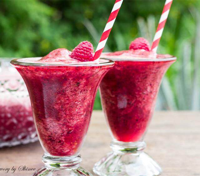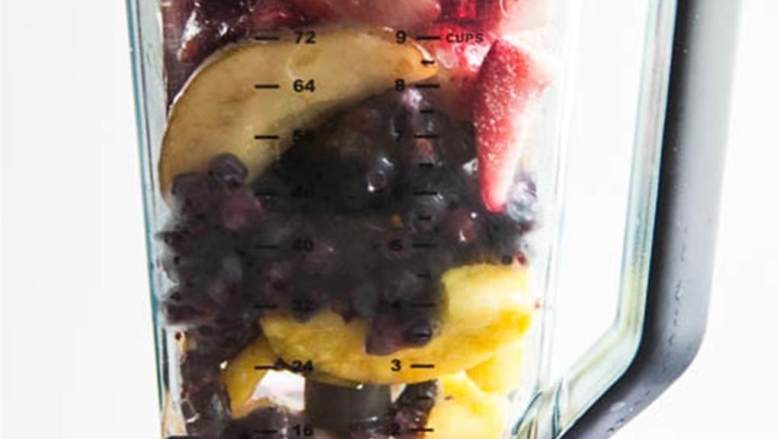 1. 把冷冻的菠萝(4片)、草莓(2 杯)、梨(1)、蓝莓(2 杯)和水(2杯)放入搅拌机内,搅拌得均匀细腻。