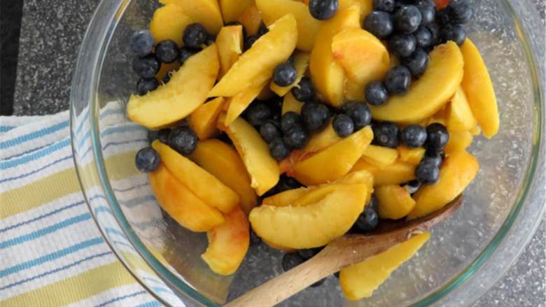 10. 在一个大碗中,将切好的桃子和鲜蓝莓(2 杯)混在一起。
