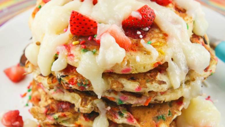 7. 煎锅热好以后,把刚才的混合物每次倒1/4杯进锅里做一个烤饼。在每块烤饼撒些五彩巧克力针 和切好的草莓,然后翻个面继续烤,每面烤3分钟。