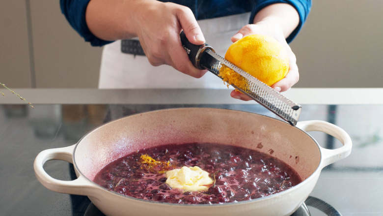 4. 取出百里香,拌入黄油和橘子皮碎,撒盐与胡椒调味。将鸭胸肉切薄片,放到上菜盘中。淋上樱桃波特酒酱享用。祝好胃口!