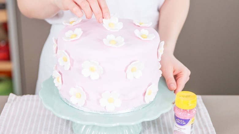 8. 用擀面杖将翻糖褶起,放到蛋糕上,确保它能多出来一些,覆盖到蛋糕各面。提起翻糖,将褶皱放平,让其均匀围绕住蛋糕各面。用锋利的削皮刀刮掉多余翻糖,使之距离蛋糕底部约为1.25厘米。用刮刀、翻糖压板或手将软糖往蛋糕底部拉伸,轻轻将翻糖压到蛋糕纸板上。这一次,让翻糖与蛋糕距离更近些,但不用拉到蛋糕底部。持续软拉伸翻糖,并去除气泡。最后,45度角切开翻糖,除去纸板上的多余部分。