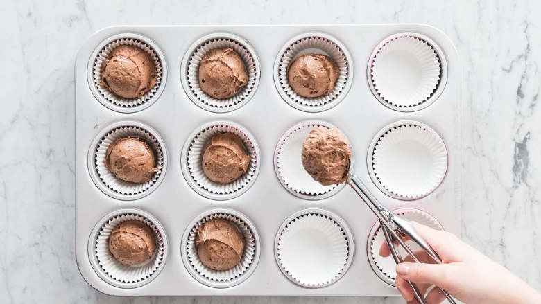 4. 在每个蛋糕杯中倒满一半面糊,放入烤箱中,以200度烤16-18分钟。放到冷却架上冷却。