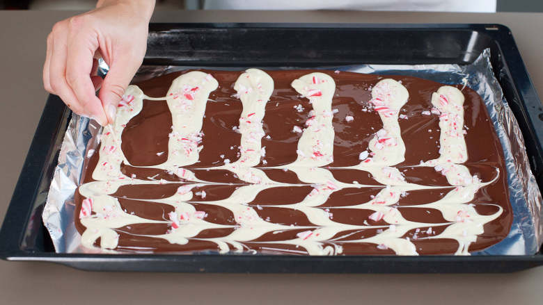 5. 将拐杖糖碎屑撒在白巧克力条上。用牙签以垂直于白巧克力的方向在其上画出旋涡形状。将烤盘水平放到冰箱中,静置约45分钟,以凝固巧克力。将巧克力切块或掰成方块享用。放在密封容器中,置于冰箱保存。