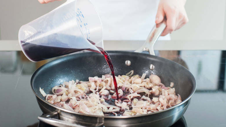 2. 煸炒红葱,使其变软、喷香。然后加入波特酒, 烧至锅中留有四分之一的液体。