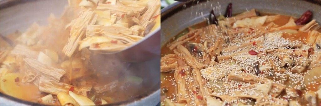 - 腐竹、杏鲍菇、丝瓜、土豆、蘑菇 美人椒、干辣椒、腰果酱、花椒 白芝麻、麻油、榨菜、生姜适量