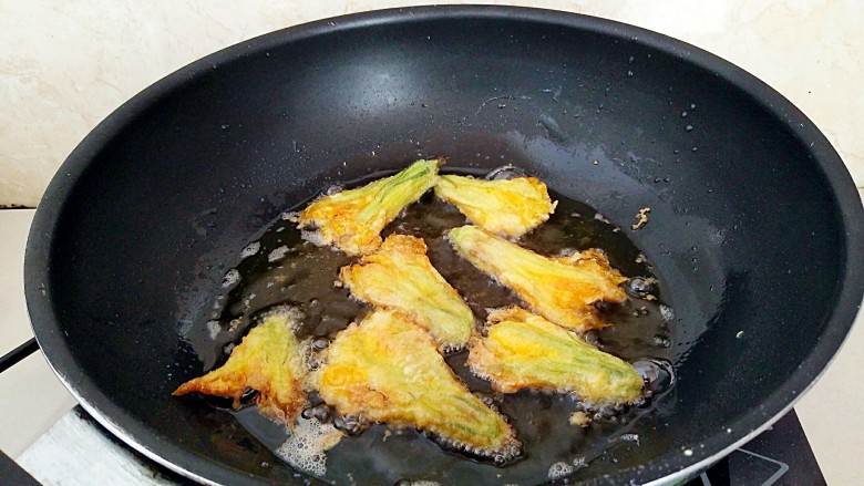 6. 烧热油锅7成热,放入南瓜花中小火炸。