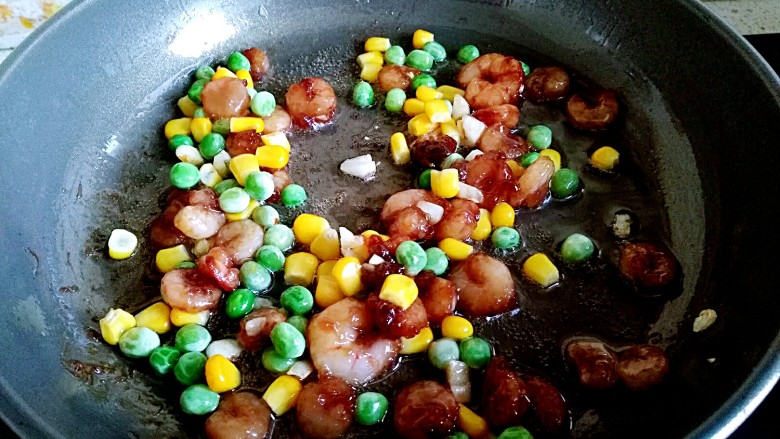 15. 倒入玉米粒,青豆粒