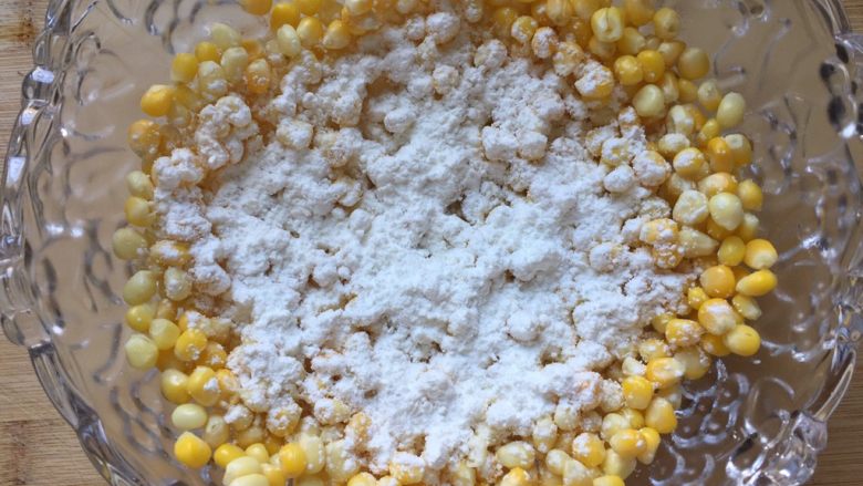 5. 在放玉米粒的碗中倒入适量干淀粉