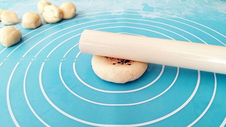 22. 用擀面杖轻轻按压,让葱陷按压均匀。
