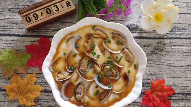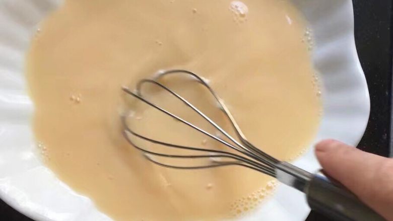 7. 然后把搅拌好的蛋糊过滤到蒸蛤蜊的盘中